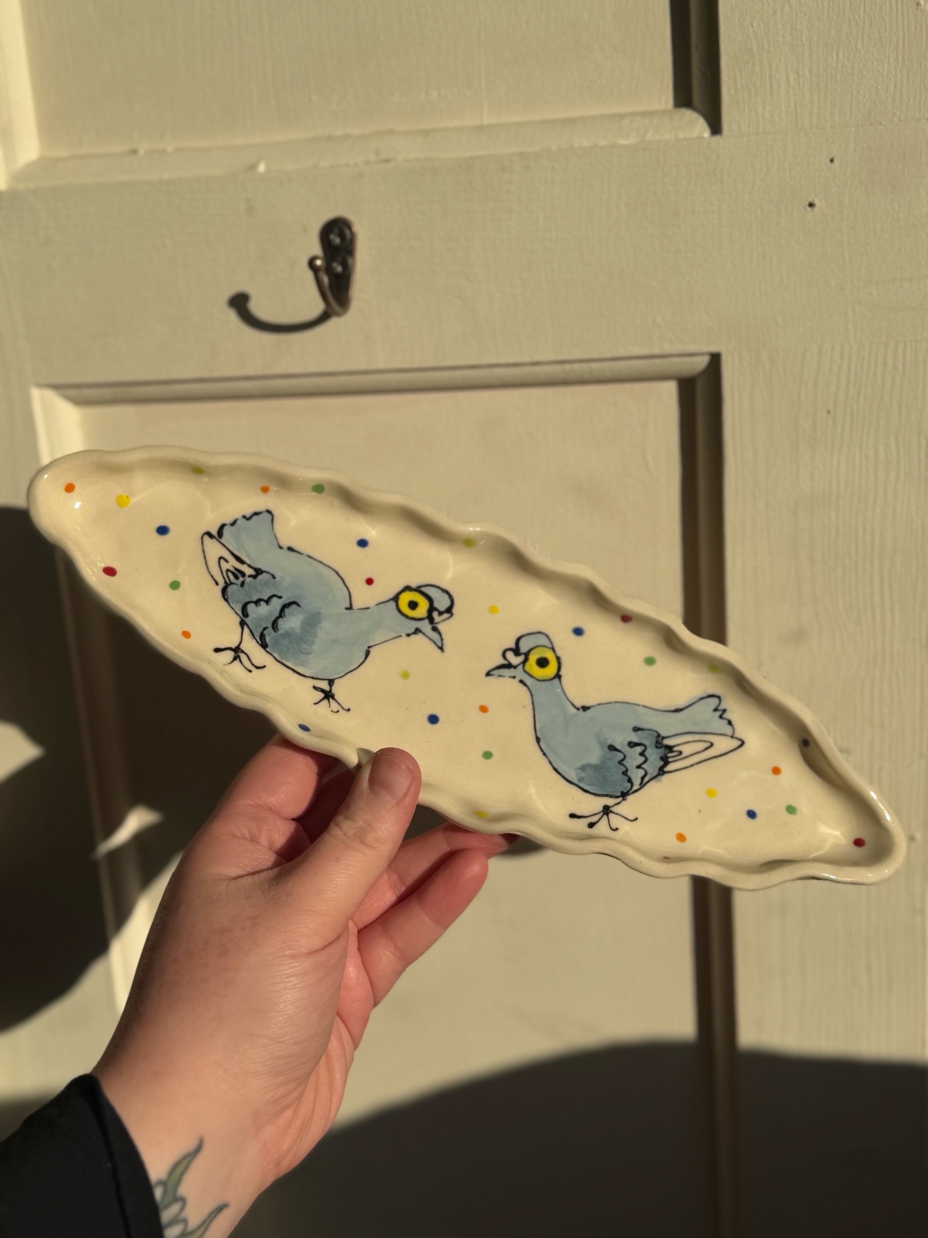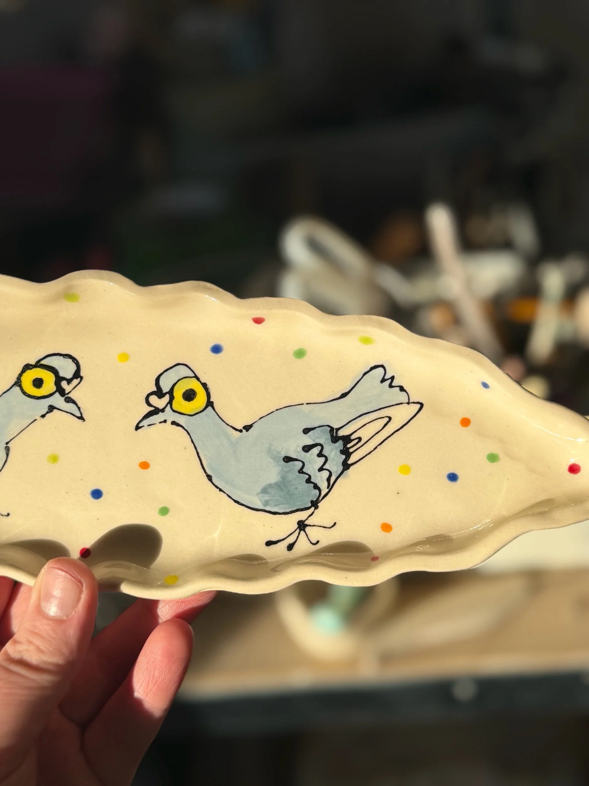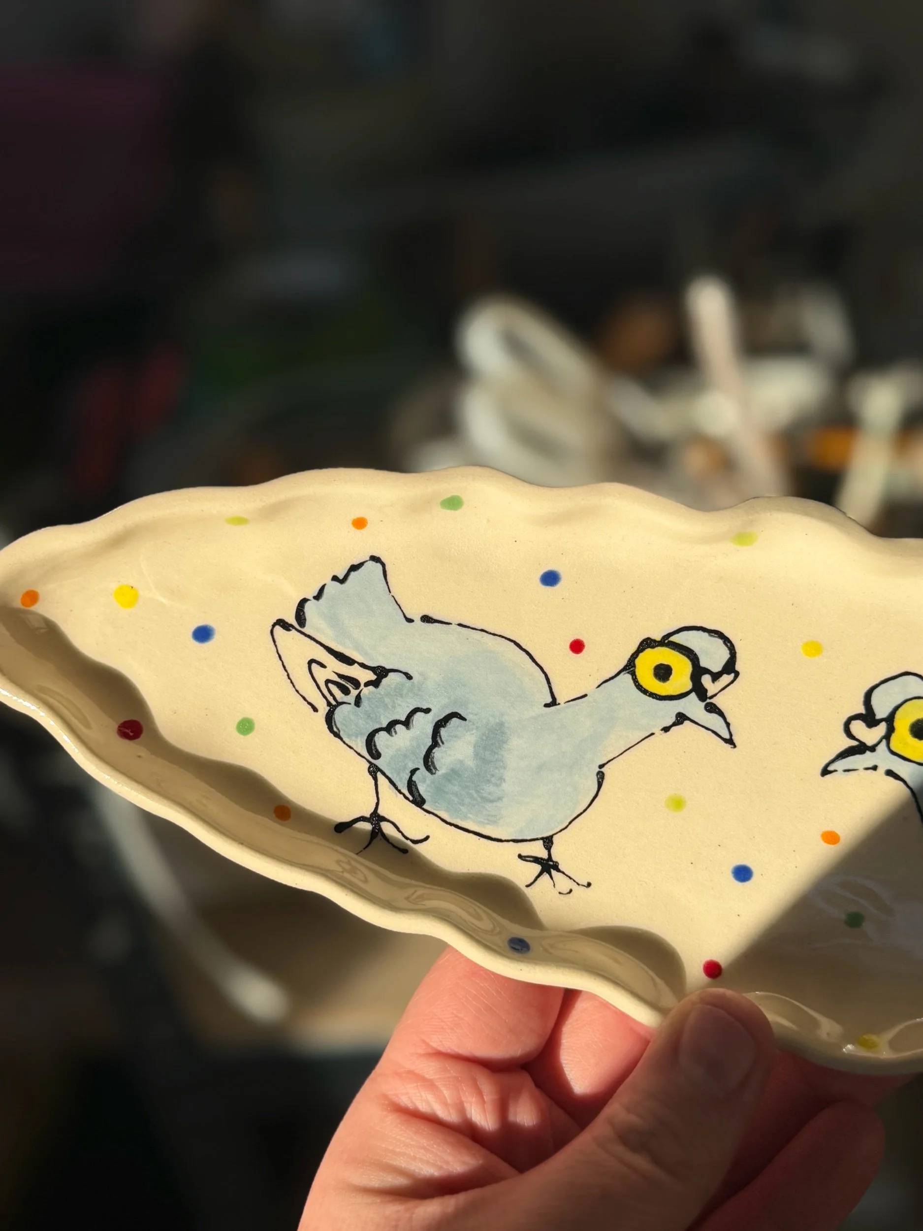 Shop › Handmade Ceramic Polkadot Pigeon Dish Image 1 of 4 Image 2 of 4 Image 3 of 4 Image 4 of 4 Handmade Ceramic Polkadot Pigeon Dish £32.00 Handmade Ceramic Polkadot Pigeon Tray Handmade and Hand Illustrated by Rachael Bell Artist in Glasgow 1 Available Add To Cart Added! Handmade Ceramic Polkadot Pigeon Tray Handmade and Hand Illustrated by Rachael Bell Artist in Glasgow 1 Available Reviews Reviewer Name Review Date Star Rating Description Posted on Etsy Product Show More